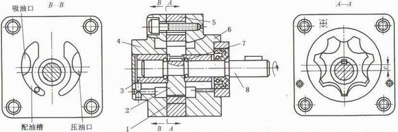 1— 外转子:2—内转子:3—轴承:4—前盖:5—泵体:6—后盖:7—弹簧卡圈:8—泵轴