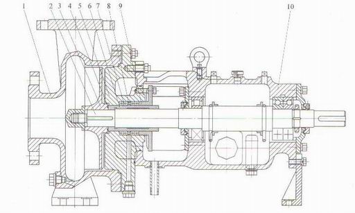 1—泵体 2—轴 3—叶轮 4—静密封 5—泵盖 6—轴套 7—填料 8—水封环 9—密封压盖 10—托架