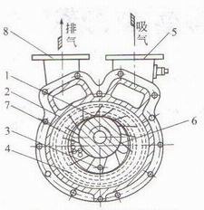 1—叶轮:2—泵体:3—注液孔:4—形成水环处:5—进气管:6—吸气窗口:7—排气窗口:8—排气管