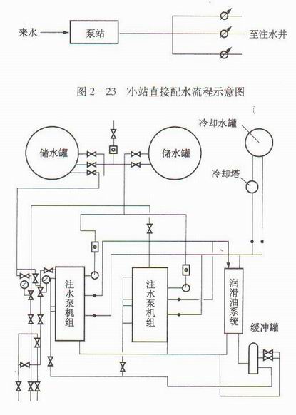 注水站工艺流程为:来水井站-计量-水质处理-储水罐-进泵加压-输出高压水,如图2-24所示。