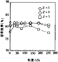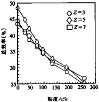 2.3 水力效率 图6表示不同叶片数条件下水力效率随粘度的变化关系。当粘度低于200cSt时,Z=5叶轮水力效率比其它叶轮高;当粘度高于200cSt时,Z=3叶轮比其它叶轮高。这种变化趋势与泵总效率随粘度的变化情况很一致,见图9。