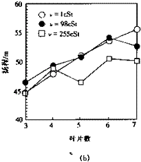 图3(a)表示在粘度为1cSt(水)、98cSt(油)和255cSt(油)条件下,采用本文方法计算的滑移系数随叶片数的变化曲线。图3(b)为实验测得的工况扬程。由图可见,滑移系数随叶片数的变化规律与扬程随叶片数的变化规律完全一致,再次表明本文计算方法是合理的。总体上,输送粘油时滑移系数与叶片数的关系基本还是线性的。
