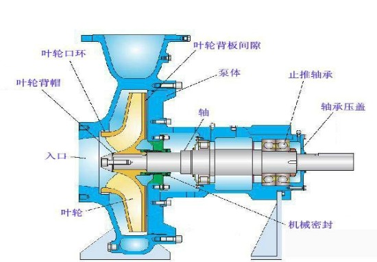离心泵在工作时,依靠高速旋转的叶轮,液体在惯性离心力作用下获得了能量以提高了压强。离心泵在工作前,泵体和进口管线必须灌满液体介质,防止气蚀现象发生。当叶轮快速转动时,叶片促使介质很快旋转,旋转着的介质在离心力的作用下从叶轮中飞出。泵内的水被抛出后,叶轮的中心部分形成真空区域。一面不断地吸入液体,一面又不断地给予吸入的液体一定的能量,将液体排出。离心泵便如此连续不断地工作。