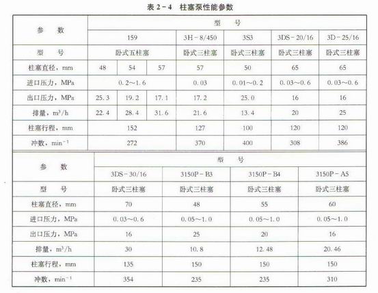 柱塞泵一般用于断块由田,县地层压力较高,注水量较小的地区。当离心泵不能满足注水需要时,一般选用注塞泵注水。柱塞泵泵较高、压力大,可分为三柱塞和伍注水俩种,其性能参数如表2-4所示。