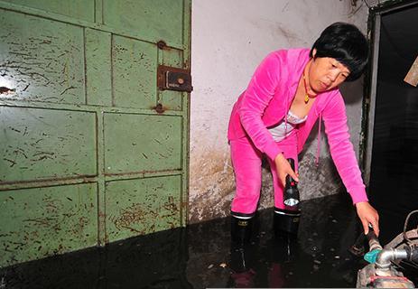 昨天上午,记者来到开南小区4号楼5单元,刚一走进单元门,一股刺鼻的气味迎面扑来,只见居民赵女士和邻居正在用水泵将地下室的污水往外抽。记者借助手电筒的亮光向下看,只见地下室成了一片“汪洋”,水面上漂浮着塑料袋等垃圾,有些没来得及搬出来的物品也泡在水里。记者简单测了一下,地下室出口处的水有四五十厘米深。“出口的地方我们把地面加高过,里面的水才深呢。”赵女士说,为了防止出现意外,二楼居民芦先生自己购买了一台水泵,他们轮流每天将地下室的水往外抽,但效果仍然不佳。